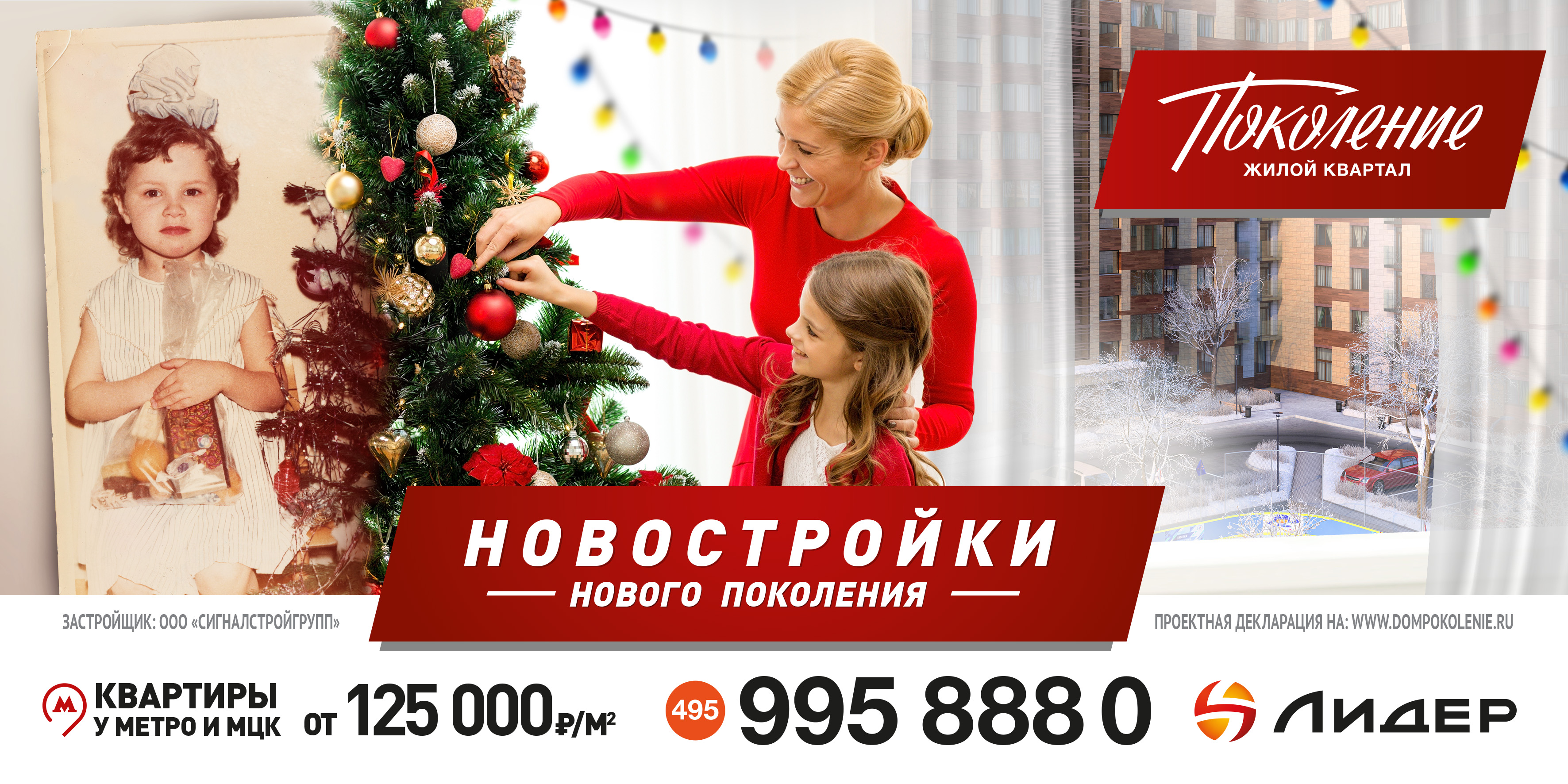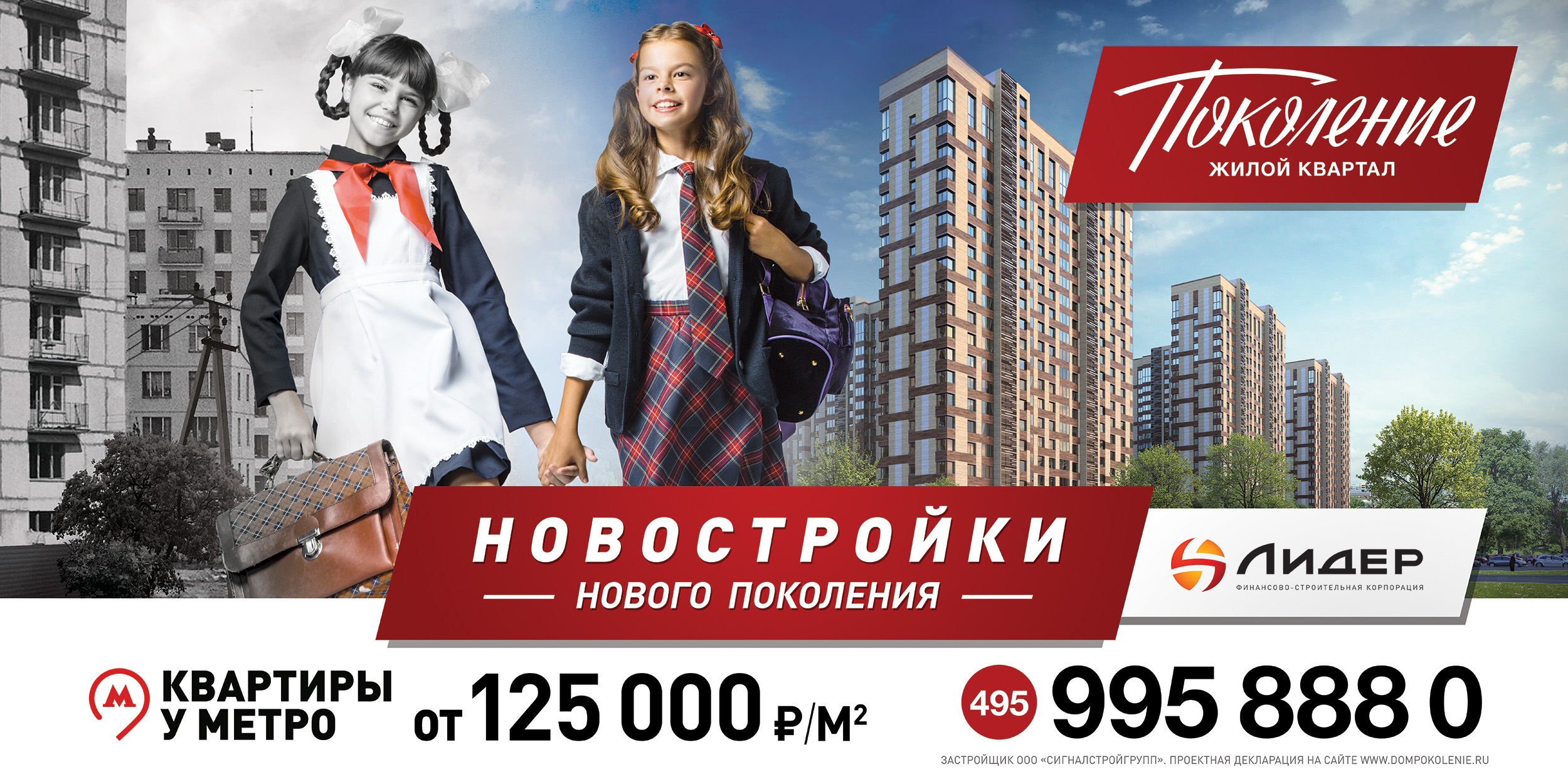 Была проведена специальная фотосессия: две девочки из настоящего и из прошлого за руки бегут в школу. Советская девочка в школьной форме с фартуком и портфелем смонтирована на фоне «хрущевки», которая в те времена была воплощением нового уровня жизни, современная девочка в форме «колледжа» с модными аксессуарами на фоне рендера квартала «Поколение».